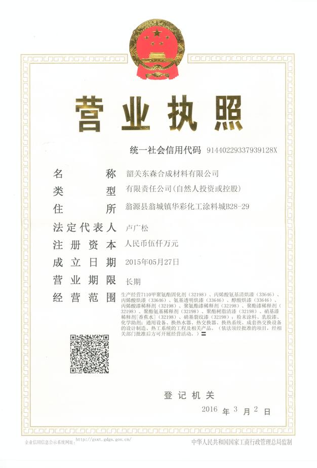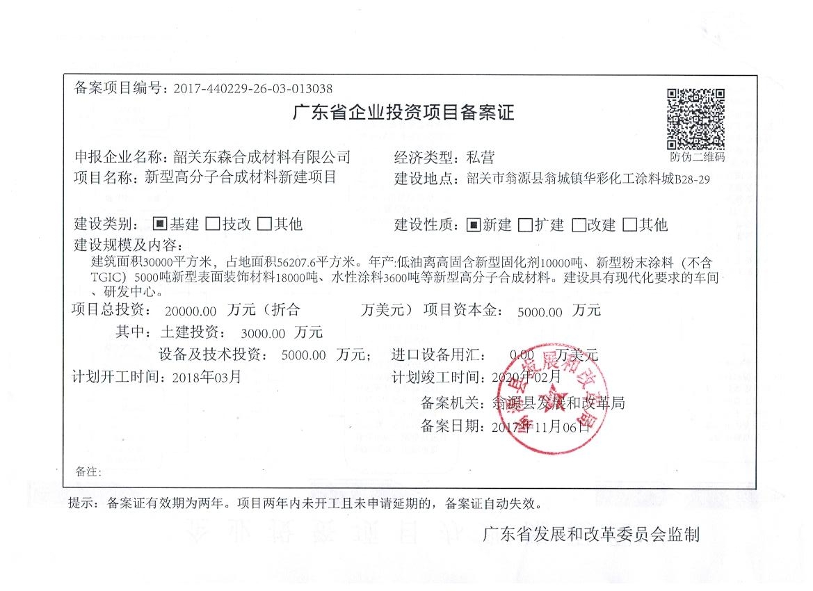 韶关东森合成材料有限公司位于广东省韶关翁源华彩化工园,是广东省省级危险化学品生产制造转移承接基地,韶关东森拥有5.6万m²的空地,已完成前期的项目立项、设计规划、环评安评、并获得用地许可,项目立项范围合适从事固化剂、树脂、油漆涂料、粉末涂料等危险化学品的成产制造。
