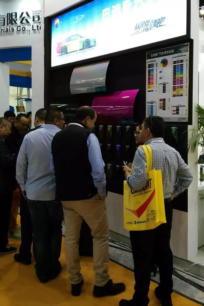 此外,东旭巴迪斯汽车漆展示的样板色彩新颖,变色龙效果在灯光下璀璨耀眼,为观众呈现汽车改色美容的艳丽效果,改变了观众对汽车涂料的传统认识,增强了汽车用户对修补漆的应用理解,拓宽了观众对汽车美容行业的审美角度,珠光、幻彩、变色效果更引发其它行业如运动器材类及渔具类企业的关注,为其它行业产品的漆膜色彩提供了更广阔的思路和选择。